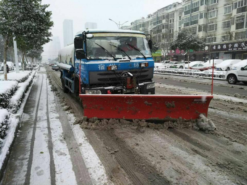 市环卫处启动《宿州市环卫处2018年冰雪天气应急预案》,提前在人行天桥等重点区域撒布融雪剂。4日凌晨起,环卫工人开始陆续作业,并出动大型推雪车、铲车,清除各自责任路段人行道、天桥、学校周边等重点区域积雪,保障行人出行安全。
