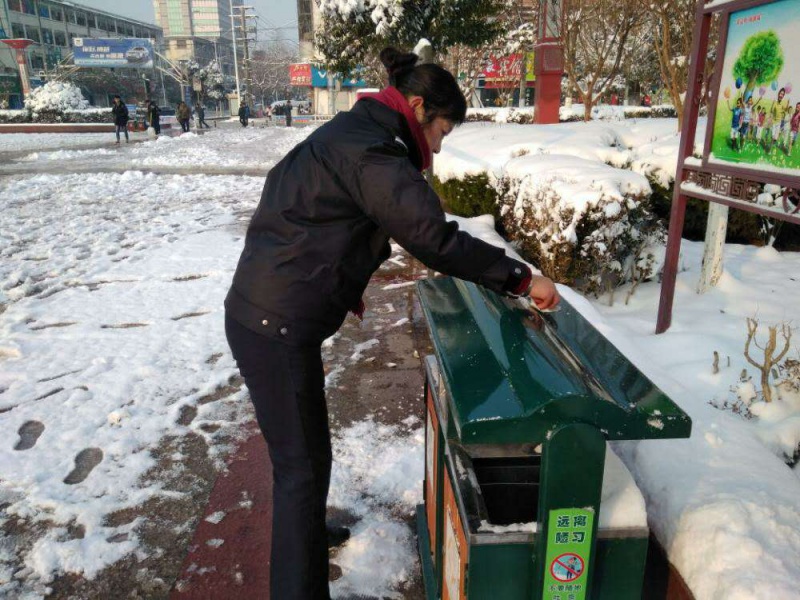 图为广场工作人员清理垃圾桶、直饮机、宣传牌等设施积雪