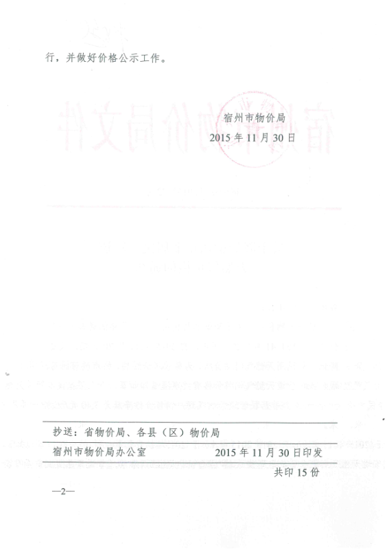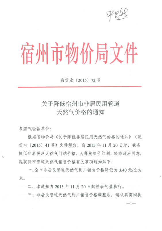 关于降低宿州市非居民用管道天然气价格的通知