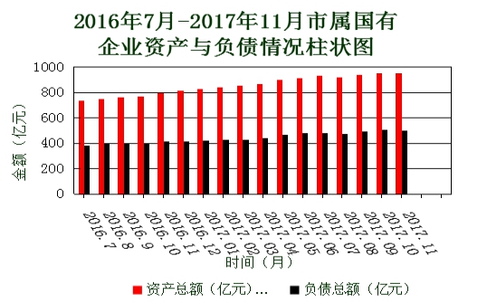 2017年11月未,市属企业资产总额中,市城投集团、市工投集团、市交投集团等9户融资类公司的资产达929.9亿元,占统计范围内市属企业资产总额的97.5%。在57户企业中,实现盈利企业32户,亏损企业25户,在不扣除客观因素的情况下,与去年同期相比,国有资产保值增值率为123.2%,国有权益净增加76.7亿元,增值23.2%。