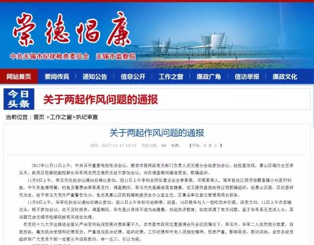 2017年11月11日上午,中央召开重要电视电话会议,要求市县两级有关部门负责人在无锡分会场参加会议。经检查发现,惠山区编办主任李玉夫、新吴区检察院副检察长华军两名同志竟然无故不参加会议,并在调查期间编造谎言,欺骗组织。