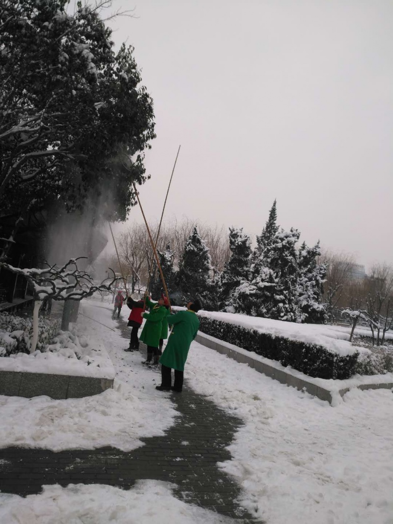 积雪压弯了树枝,图为园林工人拍打积雪,为大树减压