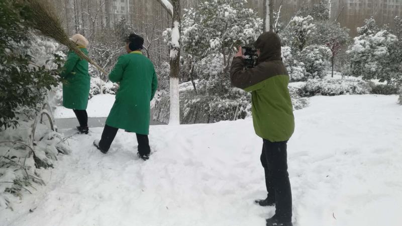 图为宿州电视台《直播宿州》栏目记者宣传报道园林铲冰除雪工作